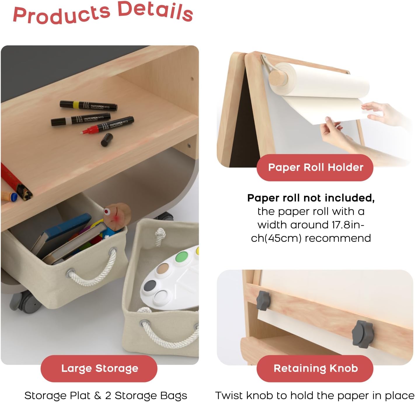 • 🖌️ Versatile 3-in-1 Art Easel: This kids' art easel features a dual-sided design with a magnetic chalkboard and whiteboard, plus a paper-roll holder (paper roll not included). Both surfaces are easy to clean with a damp cloth, allowing children to experiment with various drawing and painting techniques.